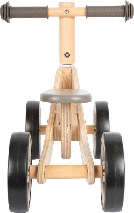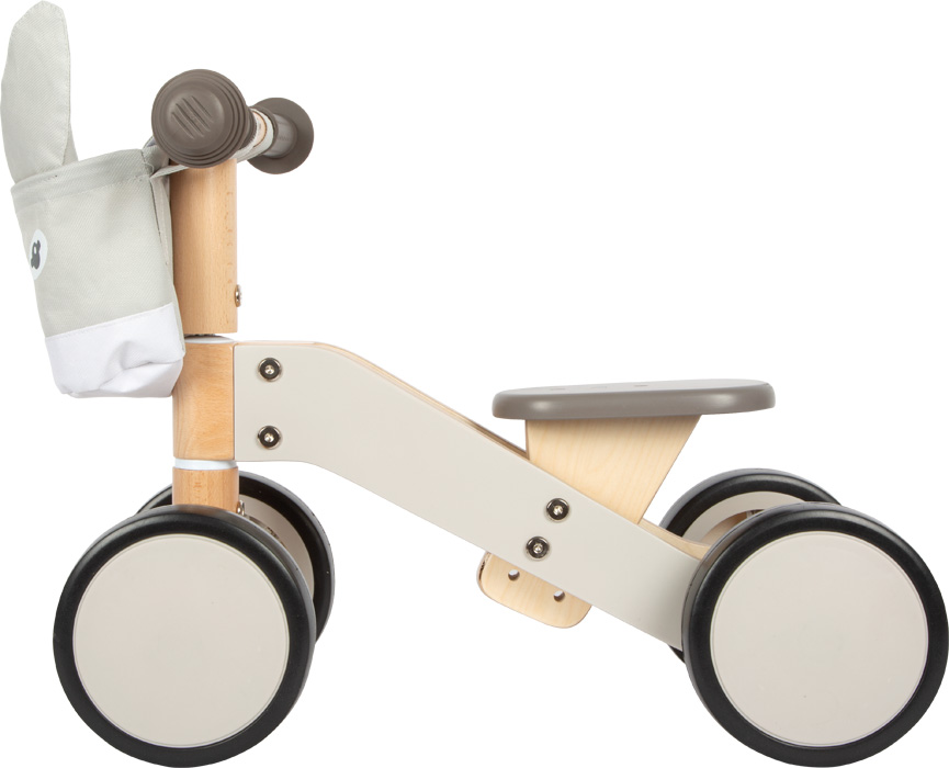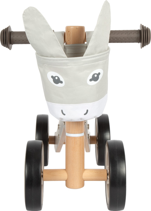 Robusni drveni skuter u toploj sivoj boji s podesivom visinom sjedala i odvojivom torbom za upravljač u obliku magarca, izrađen od kvalitetnog drva, tekstila, sintetike i gume, dimenzija približno 49 × 31 × 39 cm (visina sjedala 22–25 cm), pruža sigurno i stabilno iskustvo vožnje te kod djece najviše razvija ravnotežu, koordinaciju i motoričke vještine.