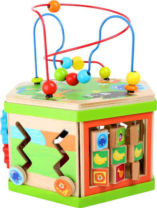 Kocka za motoričke aktivnosti izrađena od robusnog drva i metala s veselim životinjskim motivima, dimenzija cca 29 × 25 × 30 cm (visina za igru 17 cm), nudi 7 površina za igru s logaritamskim ravnalom, labirintom s perlicama i igrom oblika, a kod djece razvija finu i grubu motoriku, koordinaciju ruku i očiju te potiče znatiželju i istraživanje.