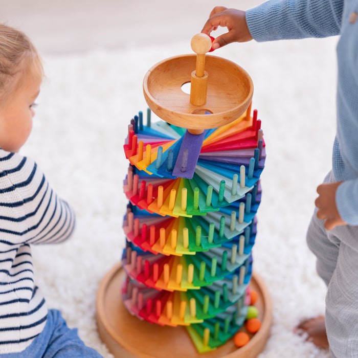 Sadržaj: 1 osnovna ploča od punog drva, 1 središnja šipka, 80 malih drvenih ploča s središnjim rupama razvrstanih po bojama, 176 drvenih tipli razvrstanih po bojama, 2 odstojnika, početna posuda, 1 završna kuglica za središnju šipku, 4 kuglična zvončića.