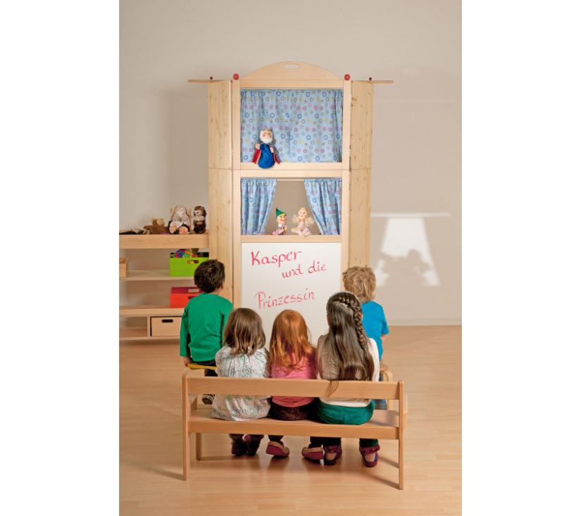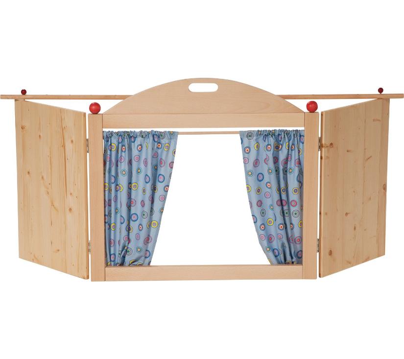 Ovo dvodijelno lutkarsko kazalište omogućuje različite vrste predstava – od stolnog i marionetnog kazališta do većih izvedbi. Prilagođeno je dječjoj visini, stabilne je konstrukcije i ima ploču pogodnu za pisanje. Sklopive bočne stranice omogućuju jednostavno spremanje i veću dubinu pozornice, potičući kreativnu i maštovitu igru. Pogodno za manju i veću djecu.