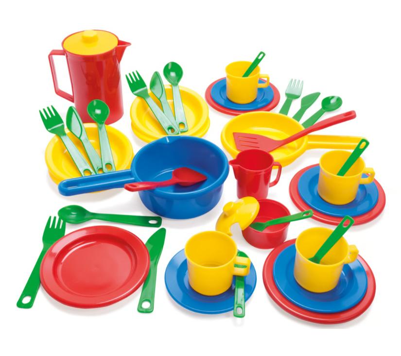 Kompletan set za igru u kuhinji koji sadrži 42 komada. Set uključuje tanjure, šalice, pribor za jelo i posuđe u raznim bojama.