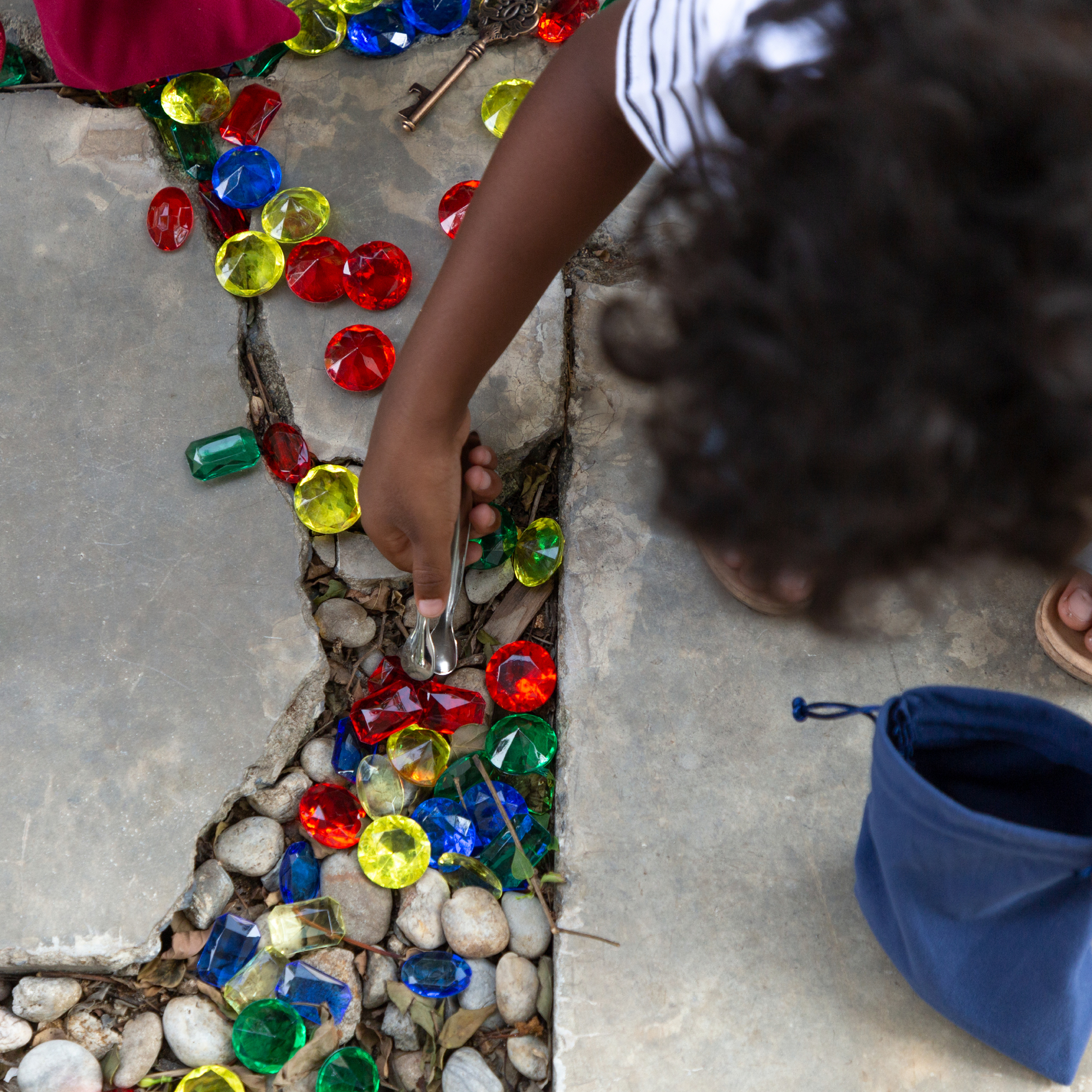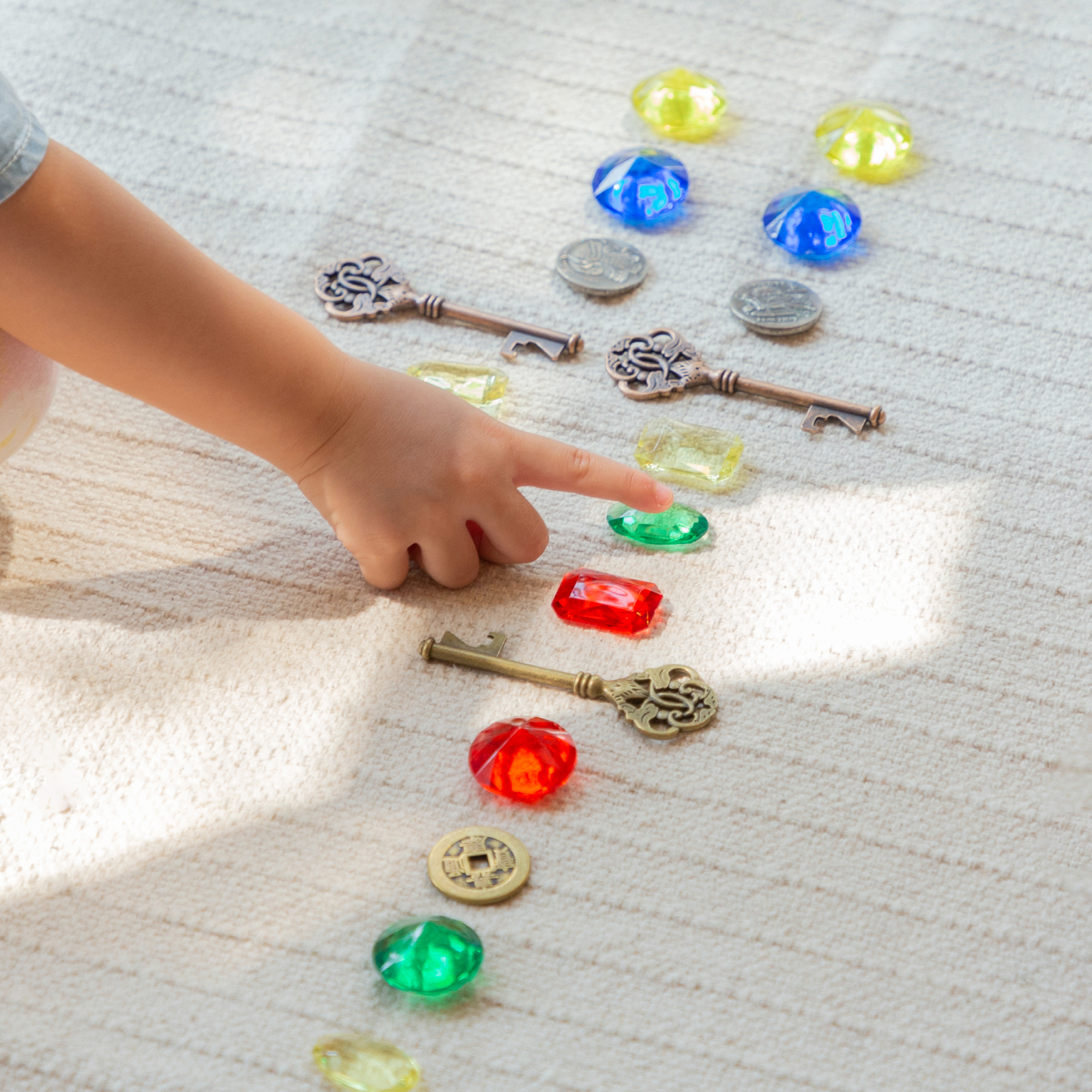 Istraživanje koncepta protoka vremena koristeći izblijedjele i sjajne predmete uključene u ovaj komplet. Replike međunarodnih kovanica, ključeva i šarenih plastičnih dragulja mogu se pohraniti i organizirati pomoću pretinca ili priloženih baršunastih vrećica.